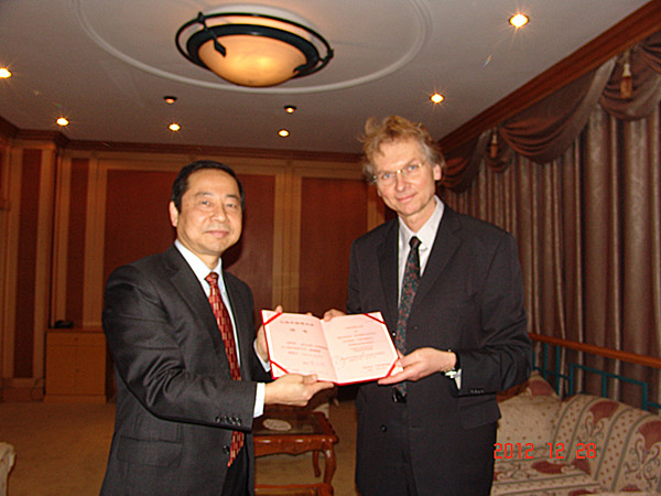 2012年12月28日上午,校长曹德明教授在虹口校区会议中心贵宾厅,会见德国比勒费尔德大学语言学与文学学系沃尔夫冈·布劳恩伽特教授,与其会谈并向其颁发上外客座教授聘书。