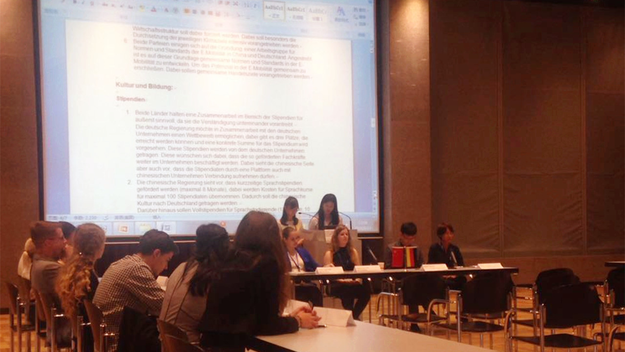 在为期四天的活动中,顾韵翊同学带领其政府代表团队,与德国学生组成的中方文化部就进一步加强与深化两国间的文化、教育与科技交流进行了探讨与协商,并最终签署了包括加大政府奖学金力度、创办足球暑期学校以及促进两国媒体合作等在内的十多条合作行动纲要。由于本次模拟大会的语言是德语,在谈判初期,中国学生组成的德方代表团不免显得被动,谈判一度陷入僵局。但是,在指导老师的帮助下,顾韵翊同学带领其团队统一了思想与方案,调整了心态与策略,使得谈判日渐顺畅,同时在危机管理中也体现了随机应变的能力。
